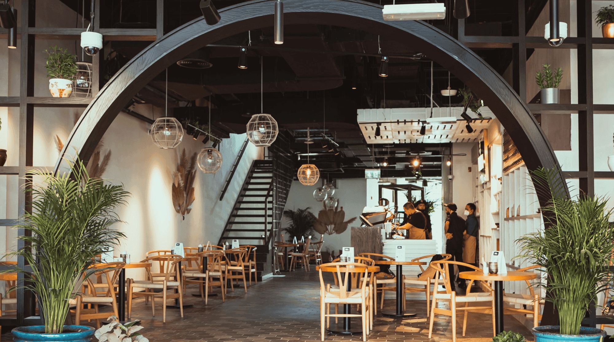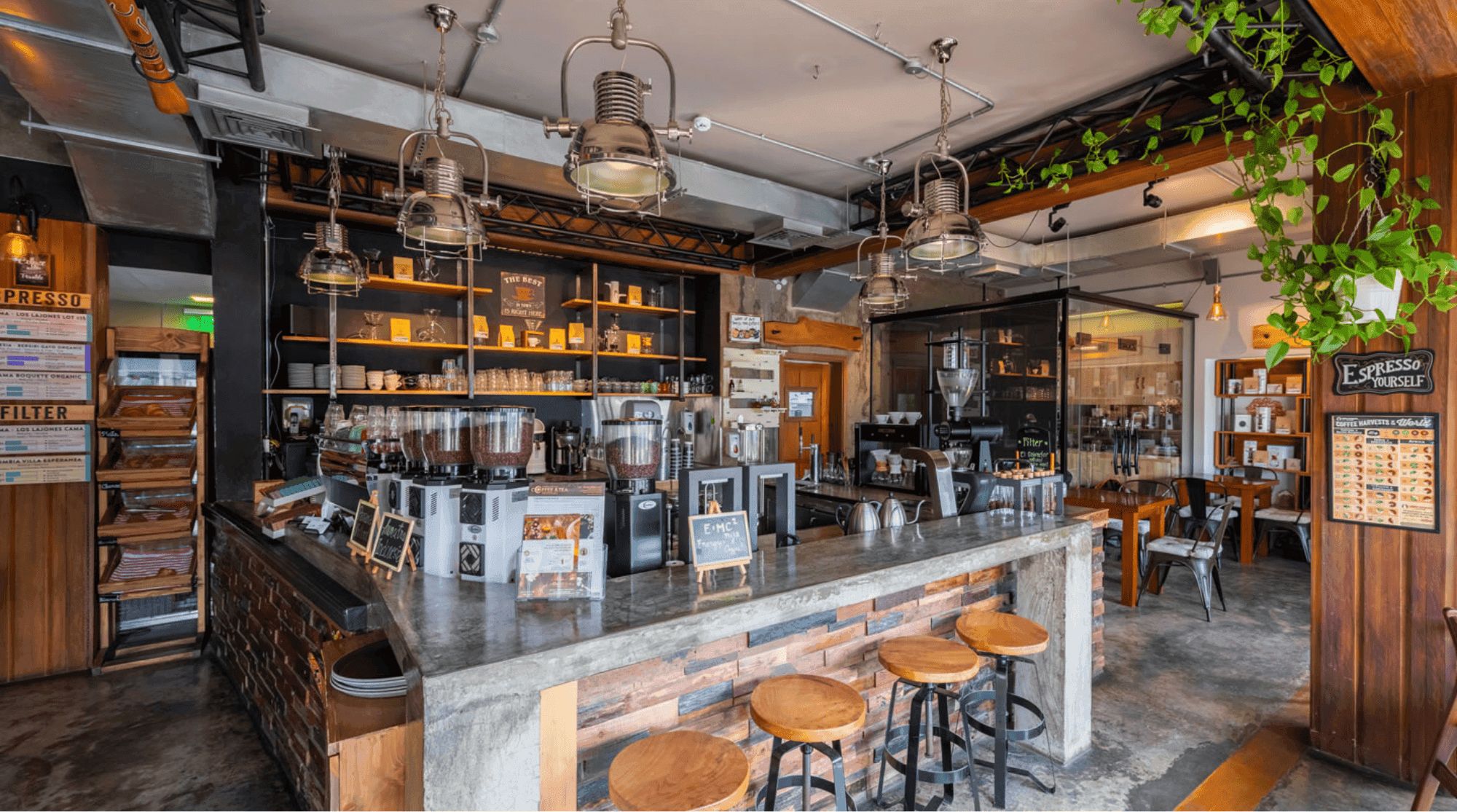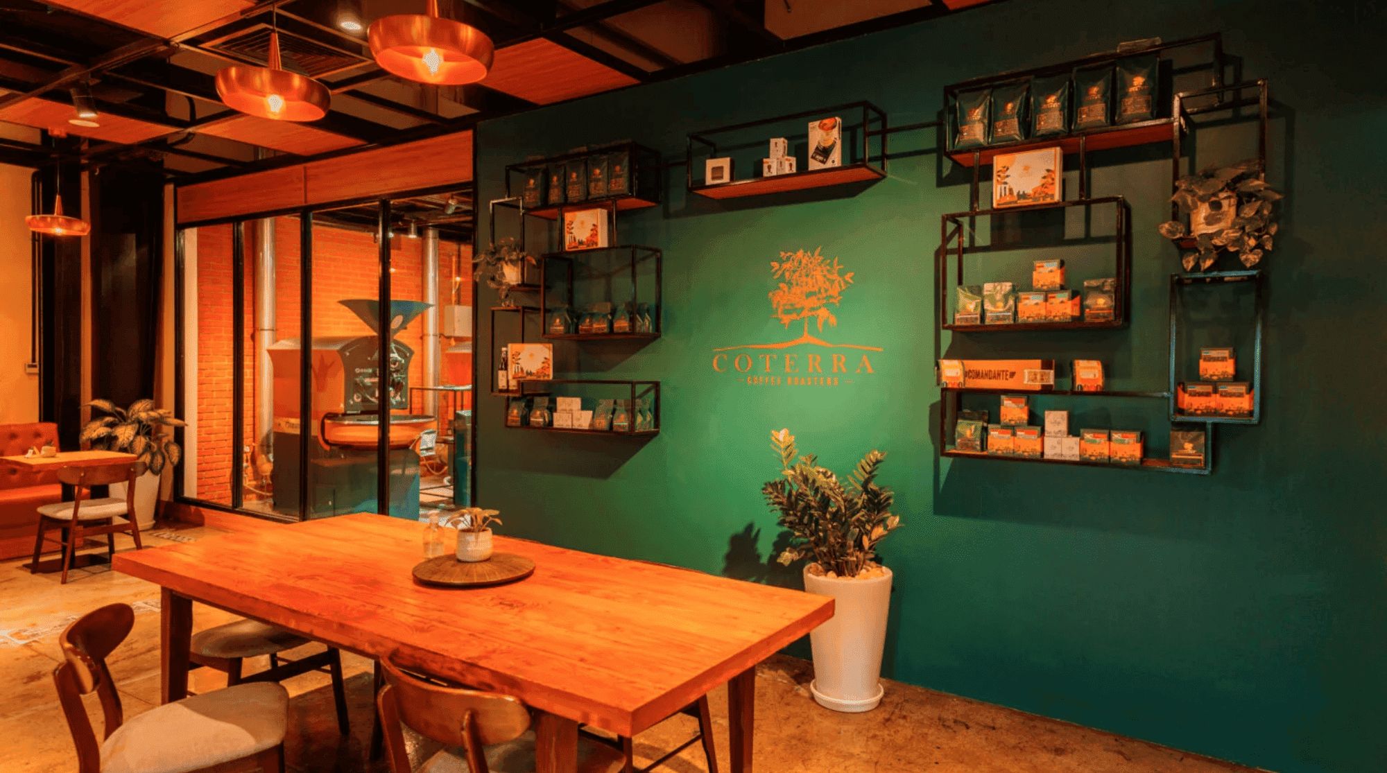 إعداد النمط المستودع يمتاز بالأسقف العالية، والعمل المكشوف، والخشب المسترد، والطاولات الجماعية الطويلة، مثالية للتجمعات حول القهوة مع الأصدقاء والعائلة. الداخل الواسعة تخدم كمنطقة استقبال لأي شخص يسعى لتجربة قهوة ممتازة.