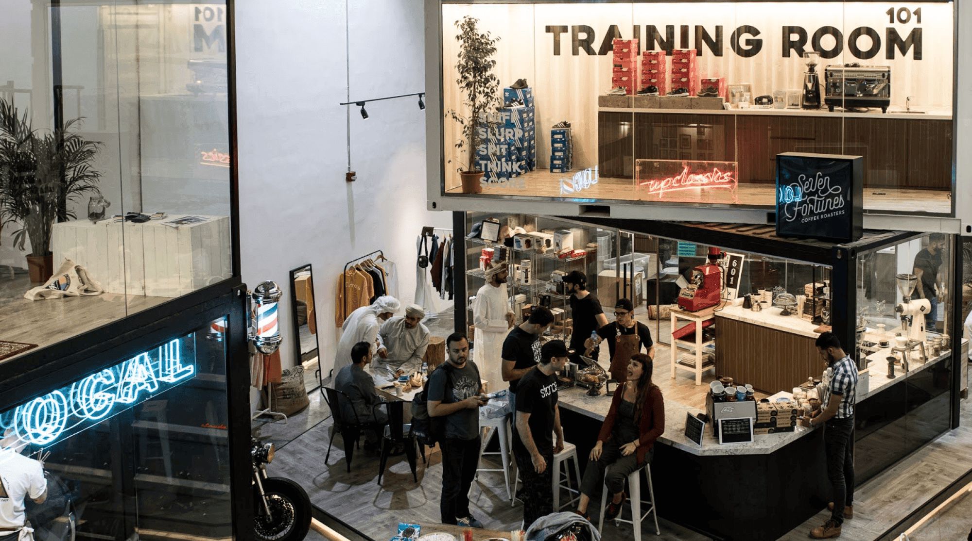 بوسطن لين هو واحة سرية داخل الفناء القوز، التي أسسها مبدعون أستراليون بحب للقهوة وثقافتها الواسعة. مقهى آخر في دبي استلهم من مقاهي الممرات في ملبورن، التصميم الداخلي يمزج بين الجدران الوردية، الموسيقى المهدئة والأثاث العتيق.
