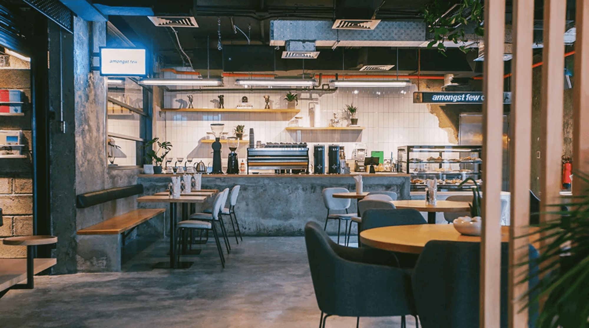 أمنغست فيو هو من أفضل المقاهي في دبي. الجو يتسم بالبرودة بلا جهد، حيث تلتقي الخرسانة الخام، والمعادن السوداء، والخشب الطبيعي، والكاميرات العتيقة للأفلام. فلو موسر ومايك تايلور بذلوا جهودًا أكثر من المعتاد للحفاظ على جمالية علامتهم التجارية ودمجها في المقهى.